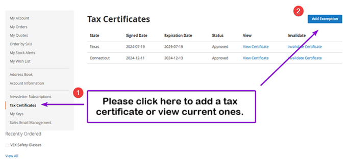 - أثناء تسجيل الدخول إلى حسابك، حدد "شهادات الضرائب" من لوحة معلومات حسابك. هنا، سوف تقوم بتحميل مستند الإعفاء من ضريبة المبيعات أو تفاصيل الإعفاء من ضريبة المبيعات. يجب أن يتم تعبئة شهادتك بشكل كامل حتى يتم اعتبارها صالحة. يجب أن يتطابق العنوان الموجود على مستندات الإعفاء من ضريبة المبيعات مع عنوان الفاتورة الذي أدخلته لحسابك عبر الإنترنت.