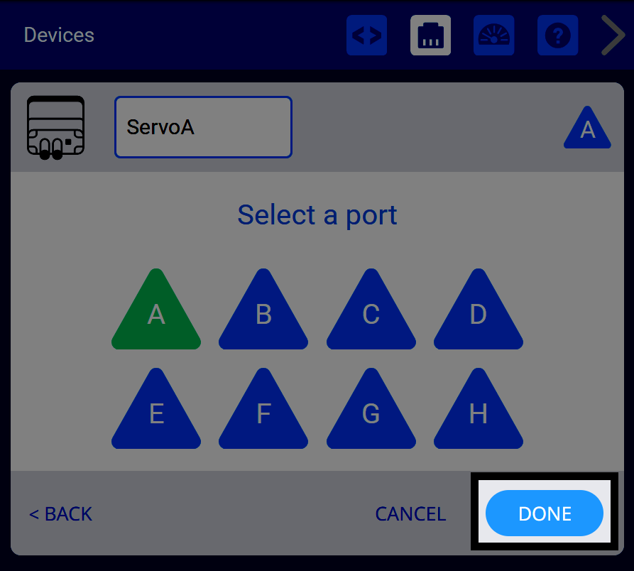ملاحظة: قم بتغيير اسم Servo عن طريق تحديد الاسم الموجود على يمين أيقونة Servo. في لقطة الشاشة هذه، تم تسميته "ServoA".