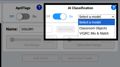 এআই ভিশন ইউটিলিটি খুলবে। AprilTag সনাক্তকরণ মোডচালু করতে AprilTags এর নীচে ইউটিলিটির উপরের ডানদিকের কোণায় টগলটি নির্বাচন করুন।