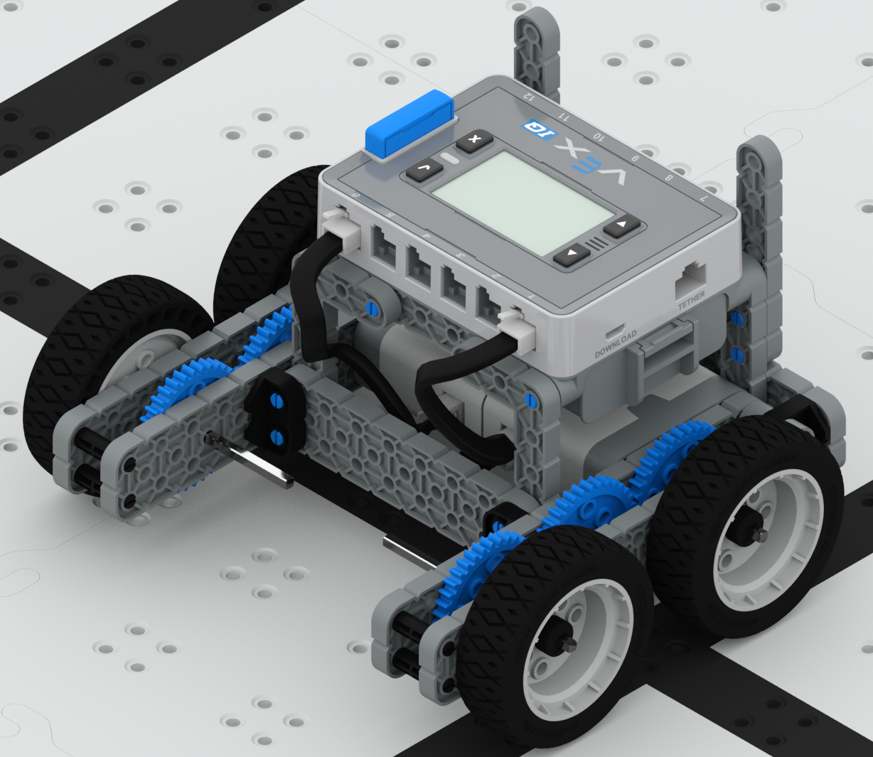 Der Track Drive ist eine weitere Variante des Standard-Antriebsstrangs, bei dem anstelle von Rädern die Tank-Lauffläche verwendet wird. Tank Tread ist im Competition Add-On Kit enthalten und mit dem Tank Tread and Intake Kit erhältlich. Mit dem Track Drive können Hindernisse problemlos überwunden werden. Allerdings fehlt dem Track Drive die Fähigkeit, omnidirektional zu sein. Traktionsglieder aus dem Tank-Tread-and-Intake-Kit können zu den Tank-Laufflächen hinzugefügt werden, um die Traktion des Antriebsstrangs zu erhöhen. Die Panzerlaufflächen werden von VEX-Kunststoffkettenrädern angetrieben.