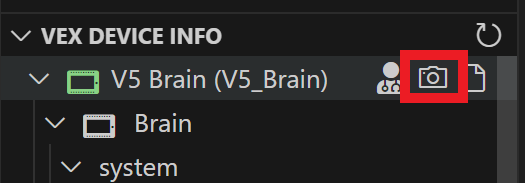 - Los íconos aparecerán junto al texto de VEX Brain. Haga clic en el icono de la cámara.
