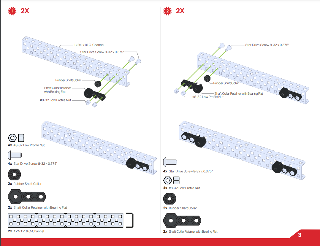 निर्माण निर्देशों में दी गई अनेक युक्तियों के अतिरिक्त, यहां कुछ अतिरिक्त सामान्य संयोजन युक्तियां दी गई हैं जो आपके पहले रोबोट के निर्माण में आपकी सहायता करेंगी। अपना पहला EXP रोबोट बनाने के लिए गाइड के लिए, VEX लाइब्रेरी से यह लेख देखें