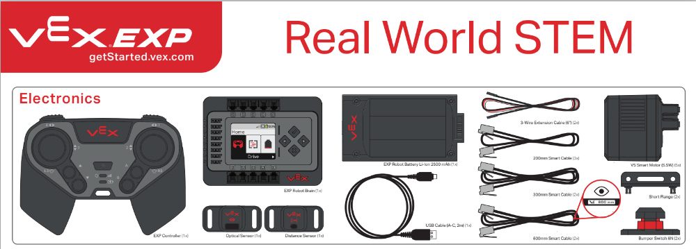 EXP इलेक्ट्रॉनिक्स में EXP ब्रेन, EXP कंट्रोलर, स्मार्ट मोटर्स (5.5W), EXP बैटरी, सेंसर और केबलिंग जैसे उपकरण शामिल हैं। संरचना & हार्डवेयर भागों में धातु सी चैनल, यू चैनल, कोण, प्लेटें, गसेट और फास्टनर जैसी चीजें शामिल हैं। गति भागों में वे सभी चीजें शामिल हैं जो चलती हैं, जैसे पहिए, गियर, स्प्रोकेट और अन्य सहायक उपकरण। अंत में, उपकरण और सहायक उपकरण में आपके EXP रोबोट को इकट्ठा करने, रखरखाव और अनुकूलन करने के लिए उपकरण शामिल हैं!