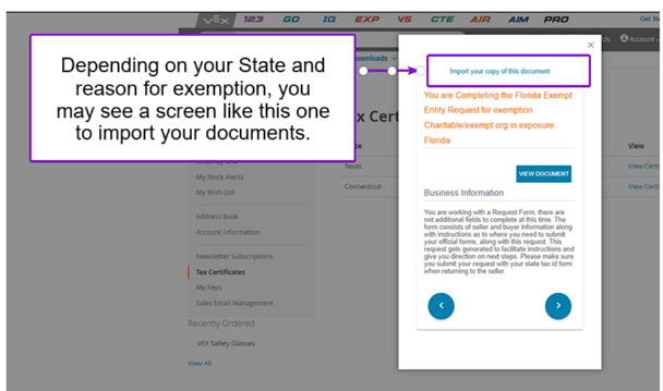 - अपने खाते में लॉग इन करते समय, अपने खाते के डैशबोर्ड से "कर प्रमाणपत्र" चुनें। यहां, आप अपना बिक्री कर-मुक्त दस्तावेज़ या बिक्री कर-मुक्त विवरण अपलोड करेंगे। आपका प्रमाणपत्र पूर्णतः भरा हुआ होना चाहिए तभी इसे वैध माना जाएगा। आपके बिक्री कर-छूट दस्तावेजों पर दिया गया पता आपके ऑनलाइन खाते के लिए दर्ज किए गए बिलिंग पते से मेल खाना चाहिए।