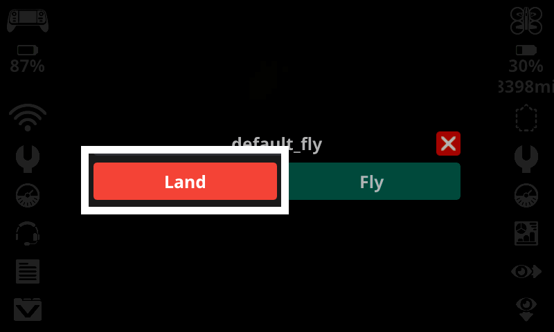 हॉर्नेट को मैन्युअल रूप से उतारने के लिए, प्रोजेक्ट चलने के दौरान टेकऑफ़ & लैंड बटन दबाएँ। नियंत्रक की स्क्रीन के मध्य में एक पॉप-अप दिखाई देगा।
