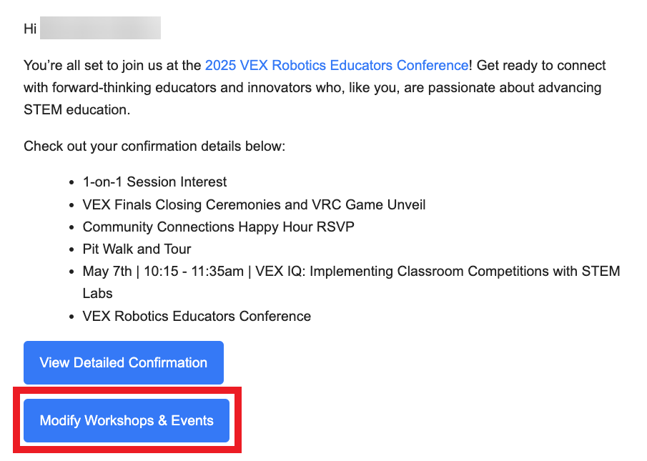 A regisztrációt megerősítő e-mailben kiválaszthatja a Workshops & Events módosítása gombot.