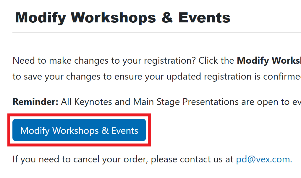 Memilih salah satu tombol akan membawa Anda kembali ke halaman pendaftaran, tempat Anda dapat memperbarui pilihan lokakarya atau acara Anda.