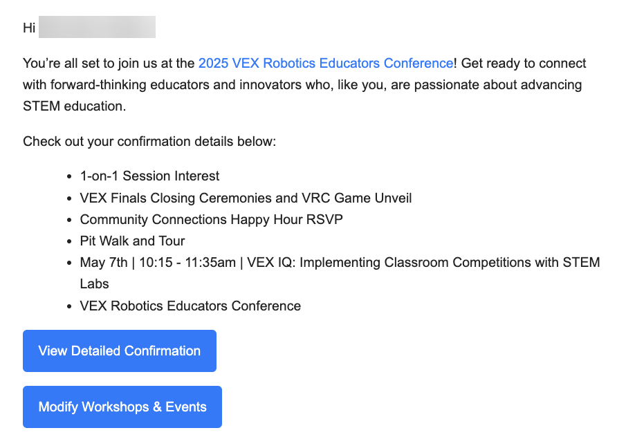 Электрондық поштаңыздан «Сіздің 2025 VEX Robotics Educators конференциясының лицензия кілті – сізді тіркелейік!» деген тақырыппен электрондық поштаны тексеріңіз.