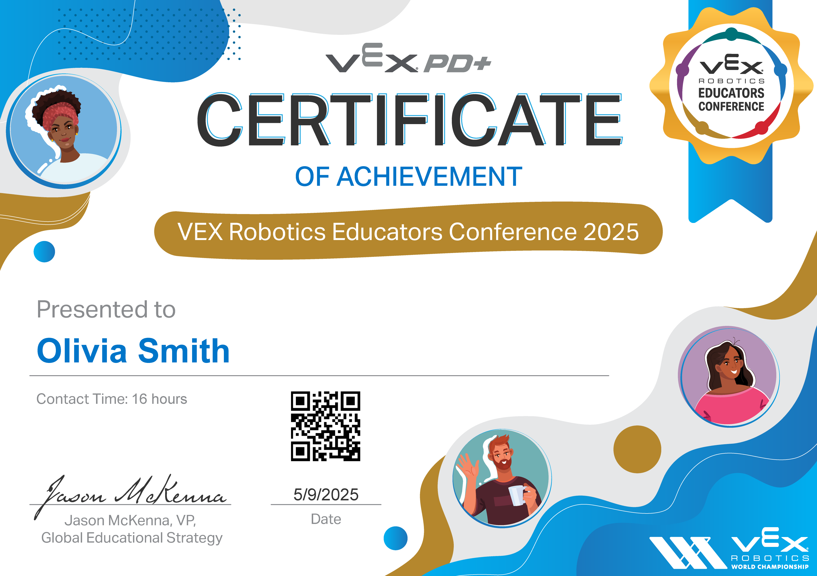 컨퍼런스가 끝나면 PD+ 대시보드를 통해 참석 증명서에 접속하여 16시간의 전문 개발을 기록하세요. 이 자격증은 귀하가 최고의 STEM 및 로봇 교육 행사에 참여했음을 증명합니다.