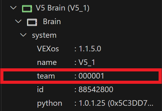Met de VEX VS Code Extension kunnen we het teamnummer voor de VEX Brain instellen, waardoor het makkelijker wordt om te identificeren aan welk team de VEX Brain is gekoppeld.
