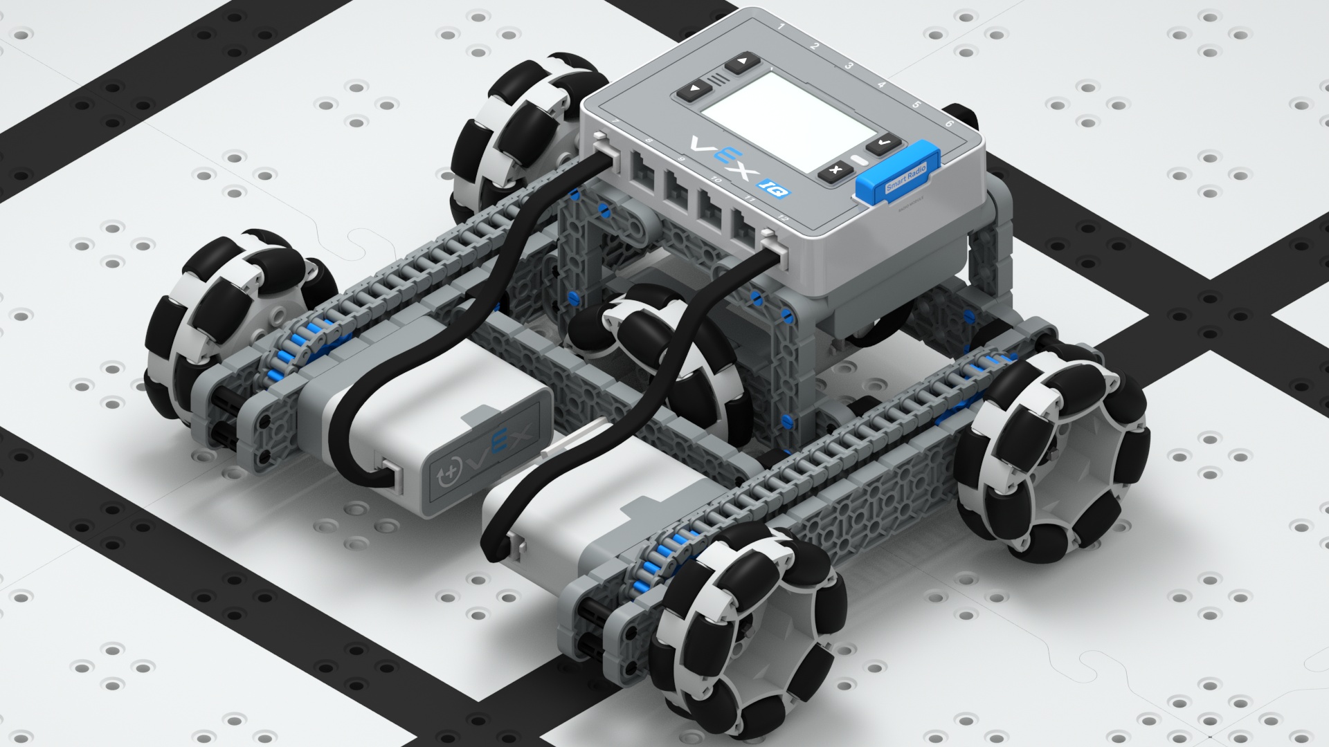 标准传动系统也称为滑移转向传动系统,是最常见的传动系统类型之一。 标准传动系统可由两个电机提供动力,这些电机可用于直接为驱动轮提供动力,也可以作为具有多个驱动轮的齿轮系的一部分。 传动系统还可以设计为具有多个电机和多个车轮。 这些变体有时称为四轮驱动、六轮驱动等。 此传动系统可使用各种 VEX 塑料轮。 但它缺乏全方位的能力。